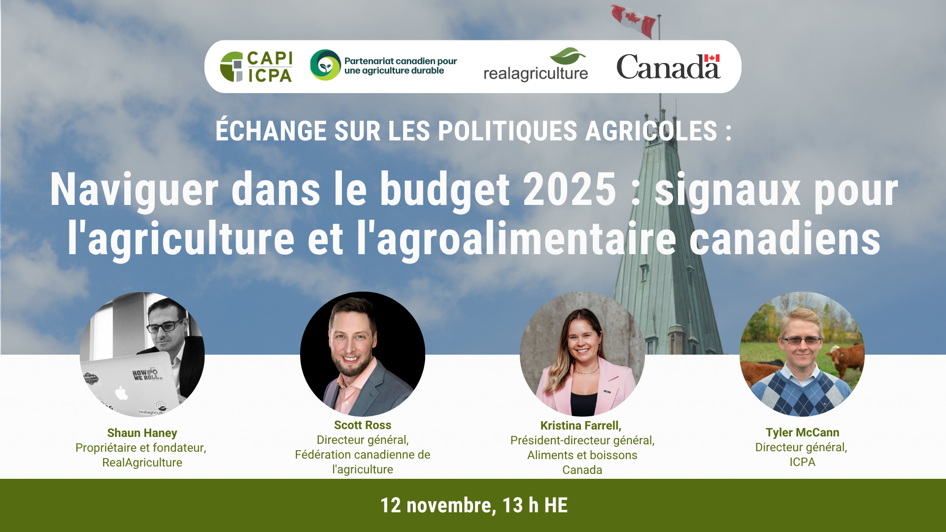 Le budget fédéral 2025 arrive à un moment charnière pour l’agriculture canadienne, marqué par l’incertitude économique, l’évolution des marchés mondiaux et les attentes croissantes envers un système agroalimentaire résilient et compétitif. Ce webinaire, présenté en partenariat avec RealAgriculture, analyse les principales mesures fiscales du budget, évalue les priorités fédérales, examine les lacunes qui subsistent dans les politiques et explore les implications pour le secteur agricole. Écoutez les leaders politiques et de l’industrie qui expliqueront ce que le budget 2025 signifie pour l’avenir de l’agriculture et de l’agroalimentaire canadiens.