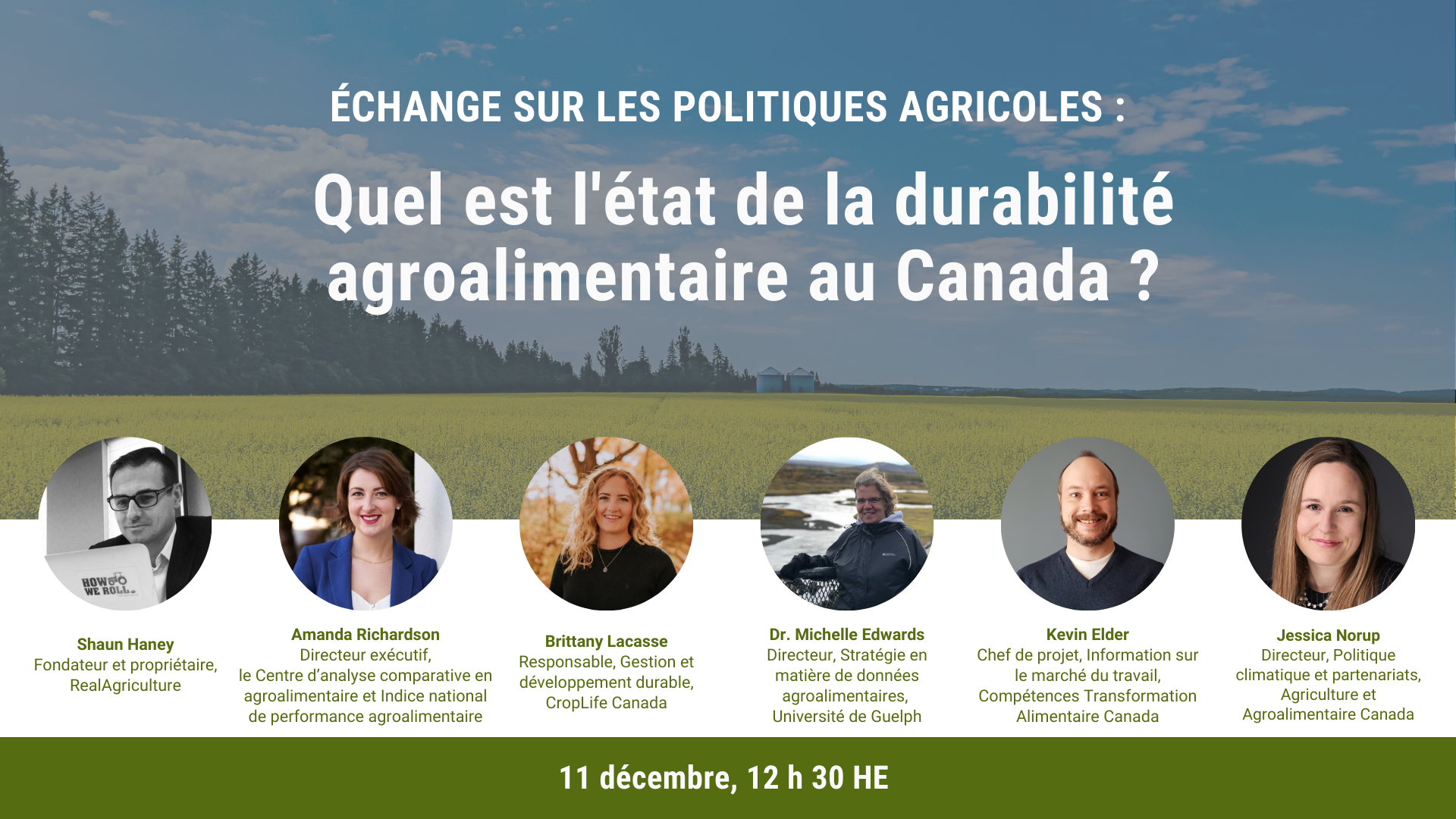 Joignez-vous à nous pour une discussion sur les antécédents, le leadership et les progrès du Canada dans la mise en place d’un système agroalimentaire plus durable, qu’il s’agisse des résultats environnementaux, de l’intégrité alimentaire, de la résilience économique ou du bien-être social.