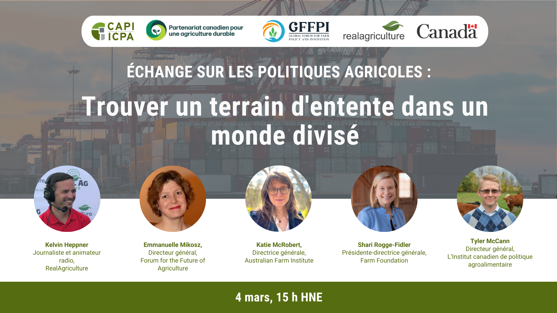 Ce webinaire, présenté en partenariat avec RealAgriculture, mettra en vedette des panélistes du Forum mondial sur la politique agricole et l’innovation (GFFPI). La discussion portera sur le déplacement du centre de gravité dans la politique agroalimentaire, les pressions qui pèsent sur l’innovation et la sécurité alimentaire, et le fossé croissant entre les ambitions politiques et leur mise en œuvre sur le terrain. Rejoignez-nous pour une conversation opportune sur les points d’accord et les mesures à prendre pour traduire les ambitions mondiales en résultats concrets et durables pour les agriculteurs et le système agroalimentaire dans son ensemble.